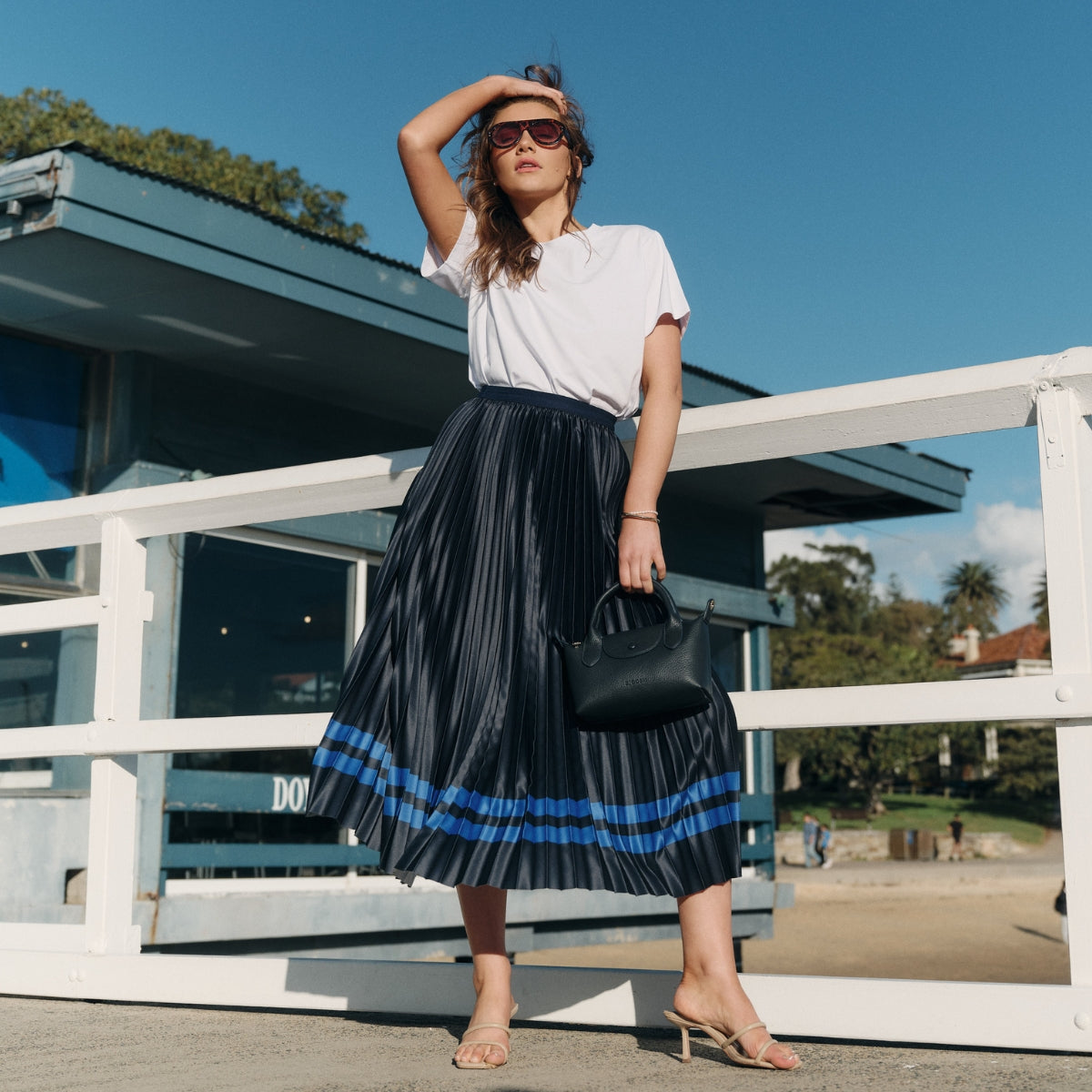 For feminine movement, the Royal Stripe Skirt and Sunray Knit Skirt in navy stripes sway effortlessly from day to night, while the Petal Dress in sky blue brings romance to long lunches and seaside strolls — airy, easy, and quietly sophisticated.