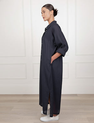 This graceful midi-length dress features a classic shirt dress silhouette with a functional button-down front, allowing for adjustable comfort. Whether you're unwinding at home, enjoying a leisurely brunch, or strolling along the beach, The Aiko Dress offers versatile elegance. It comes with a coordinating slip included, ensuring complete modesty and a smooth, opaque drape for all your activities.