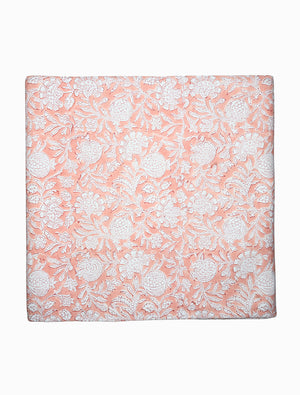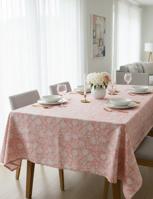 Enjoy your dining moments with the Chandini Tablecloth Peach 150cm x 320cm. Made from 100% cotton, this stunning peach tablecloth showcases a delicate hand block-printed pattern in peach and cream hues, offering a warm, welcoming touch to your table setting.