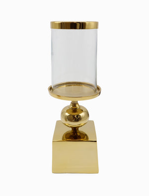 The large Gold Ball Hurricane Candle Holder is the ultimate statement piece for your home or entertaining space. Crafted in dazzling gold, this luxurious candle holder features a striking round ball perched atop a square base, creating a captivating contrast.