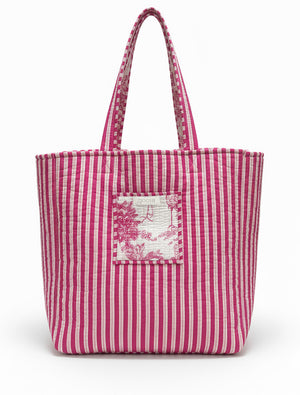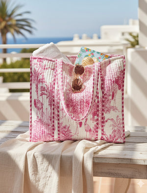 Crafted from a soft, 100% cotton quilt that feels as luxurious as it looks, this isn't just a bag – it's a statement. The vibrant, hot pink toile print, reminiscent of exotic island landscapes and elegant flamingos, is pure Zjoosh magic. It’s bold, it’s beautiful, and it absolutely pops against the crisp white background, making it the perfect accessory to elevate any outfit.