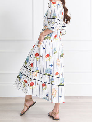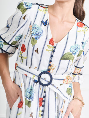 Breezy, beautiful and easy to wear. It’s 100% linen, so it feels cool and breathable on warm days. The print is a crisp grid with garden motifs that really pops in photos. The shape is flattering without trying too hard: soft V neckline, button front, a belt to cinch the waist and a full skirt that moves nicely when you walk.