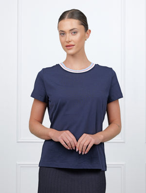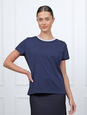 This navy knit tee is a versatile wardrobe essential that pairs beautifully with jeans, skirts or sneakers. Whether you’re dressing it up with a jacket or keeping it casual on its own, this knit collar tee adds a polished yet effortless touch to your look.