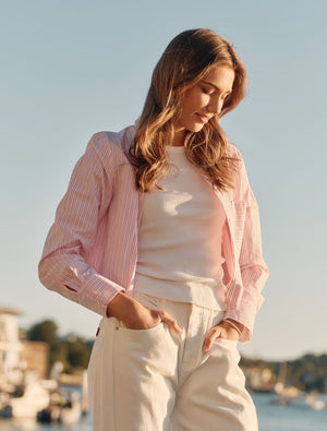 The Leigh Cropped Stripe Shirt Pink is your new go-to for easy, effortless style. Crafted from 100% cotton, this playful cropped shirt features soft pink stripes, a classic collar and a relaxed silhouette that’s both flattering and fun. The shorter length makes it perfect for high-waisted trousers or skirts, adding a fresh, modern touch to your everyday wardrobe.