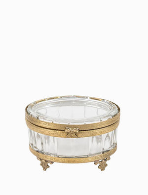The Lolita Oval Trinket Box is a charming vintage-inspired piece, featuring etched glass with brass-coloured iron detailing. Petite in size but full of character, this elegant glass trinket box is perfect for storing rings and other cherished treasures while adding a touch of vintage flair to any space.