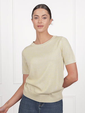 The Melanie Short Sleeve Sparkle Knit Gold combines the luxurious feel of bamboo and lurex, bringing a subtle touch of golden shimmer. This beautifully designed piece is fitted and true to size, offering a flattering shape that’s perfect for both day and evening wear.