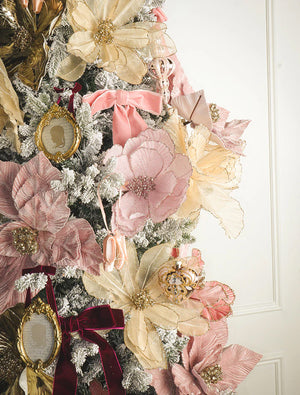 The Pink Rose Gold Edge Clip-On is a sophisticated floral accent that adds a touch of glamour to your holiday décor. With its soft pink petals delicately edged in rose gold, this flower exudes elegance and festive charm.