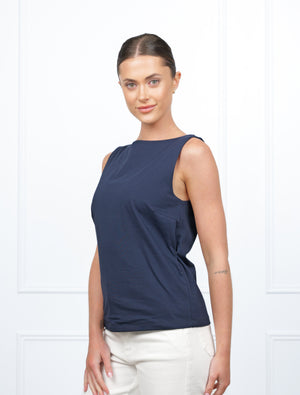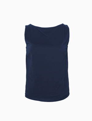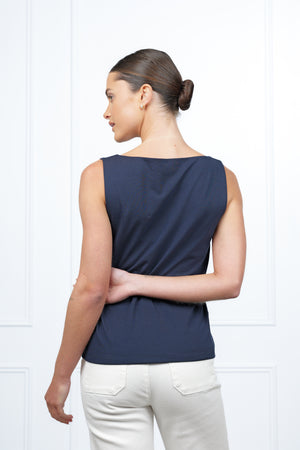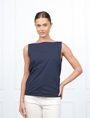 Perfect for layering under a blazer, pairing with denim for a relaxed edge, or styling with a skirt for a more elevated look, the navy shell top adapts beautifully to any occasion. With its clean lines and refined simplicity, it’s the ultimate wardrobe foundation for creating outfits that feel both effortless and put-together.