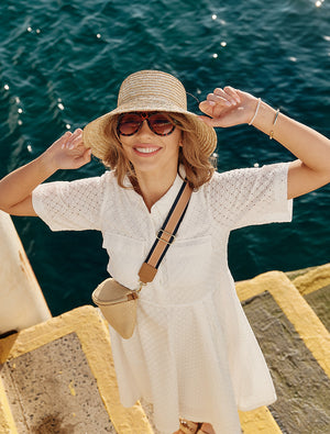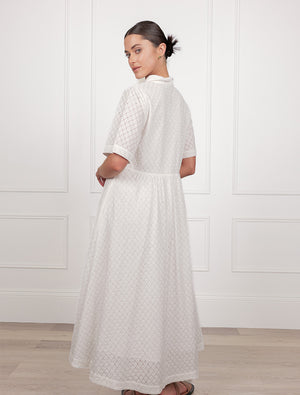 The Valetta Lace Dress in White captures effortless elegance with its soft broderie cotton design. Crafted from 100% cotton, this dress feels light and breathable, making it perfect for warm days or relaxed gatherings.