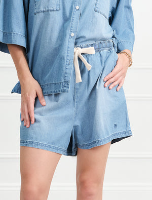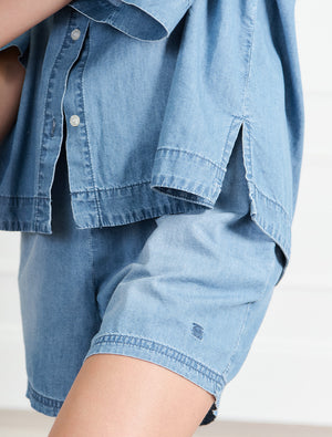 Elevate your everyday with the Veronique Denim Short. Cut from 100% cotton denim with a soft, lived-in hand feel, this style delivers comfort without compromising on brand polish. The relaxed, mid-rise silhouette is designed for easy wearability through warm weather, while the elasticated waistband and functional drawcord enable a personalised fit that moves with you.