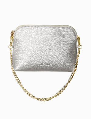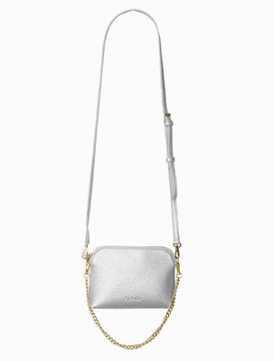 The Hudson Junior's sleek design features gold hardware, a slim PU cross body strap and an elevated gold chain addition. This silver purse's flat base ensures it can rest standing up without falling over. Featuring internal card slots and an external pocket, the Hudson Jr is as functional as she is adorable.