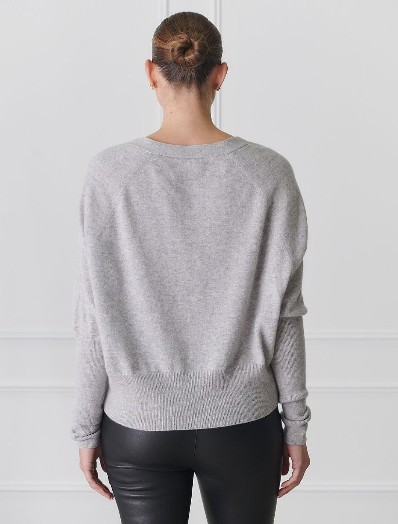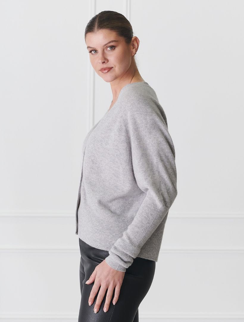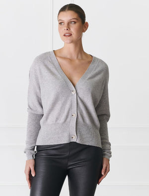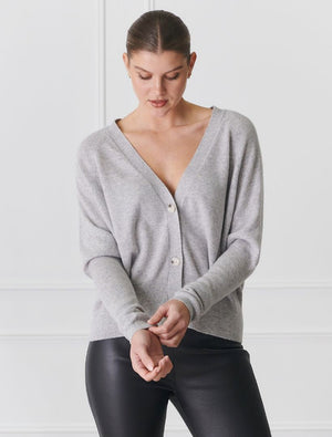 The Collette Cardigan Grey is a beautifully feminine piece crafted from the softest pure cashmere, offering unmatched warmth and luxury. This light yet incredibly warm V-neck cardigan is perfect for layering or wearing on its own, making it a versatile addition to your wardrobe.