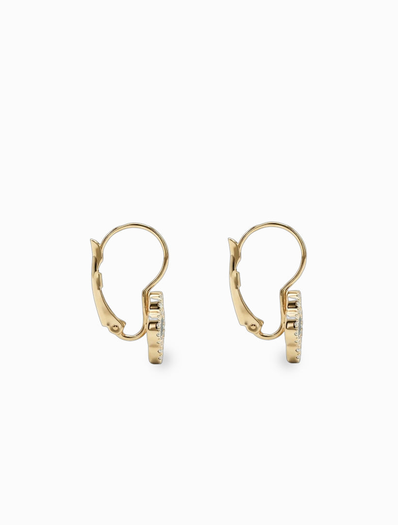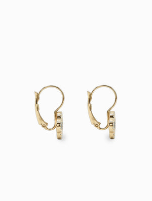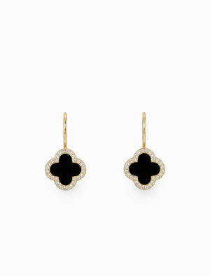 These striking gold French hook earrings feature an elegant clover design with a sleek black enamel inlay. The contrasting black is beautifully framed by a delicate border of sparkling crystals, adding a touch of sophisticated shimmer.