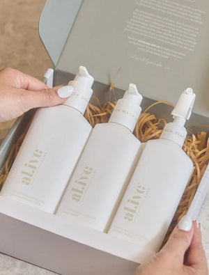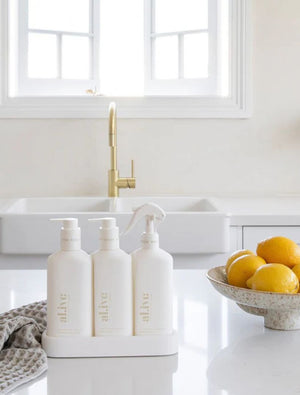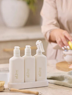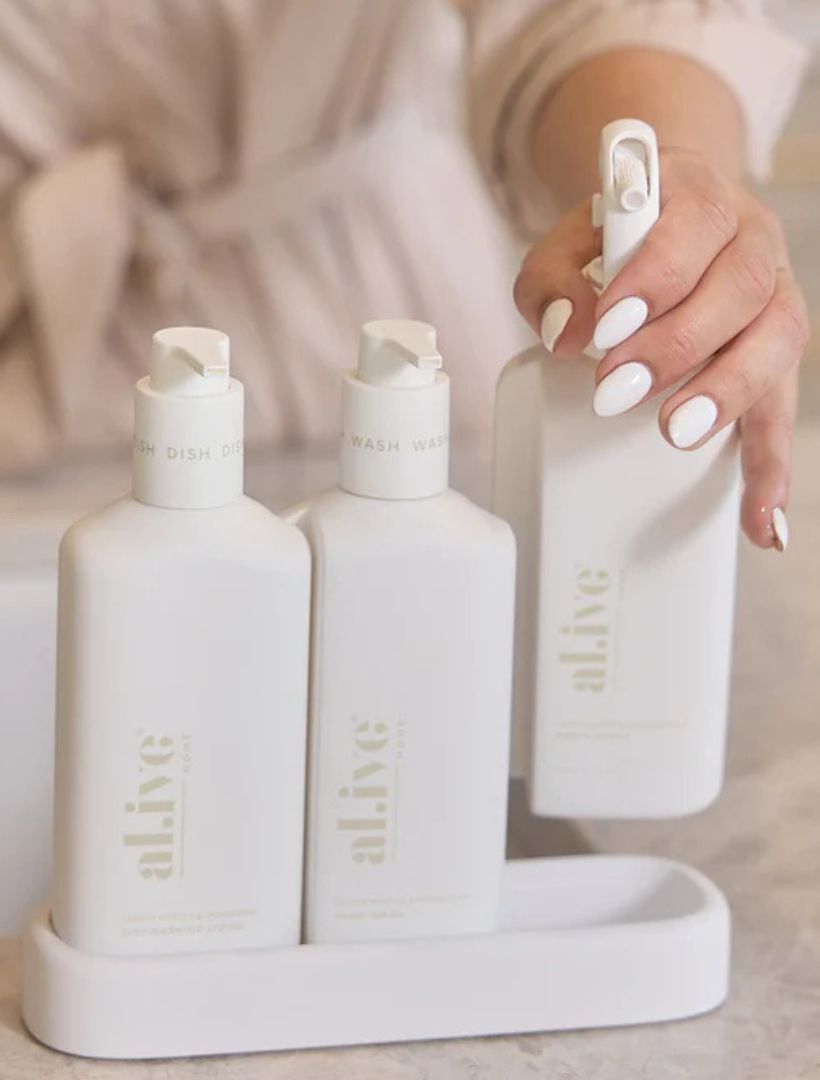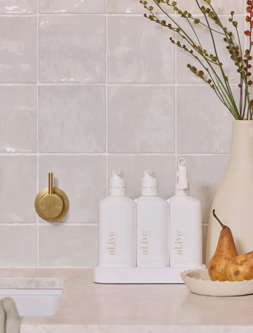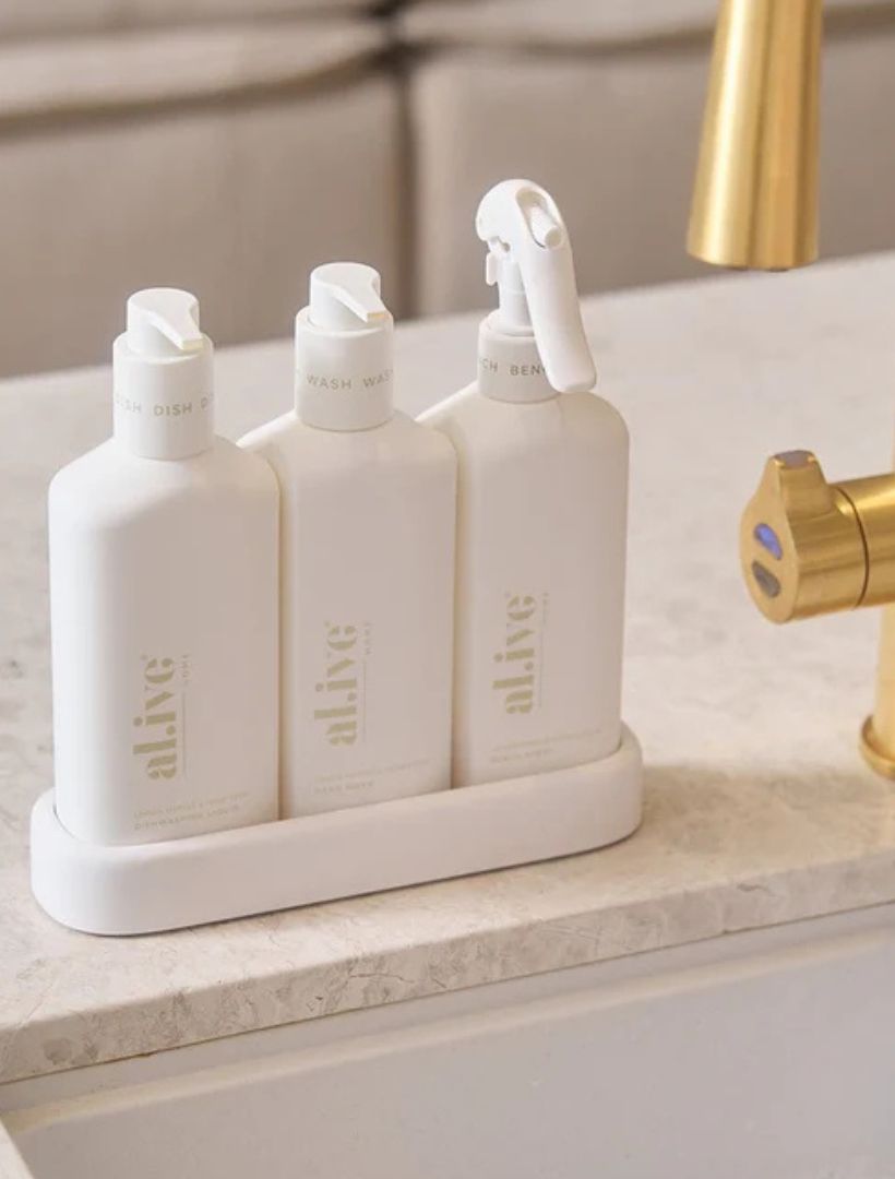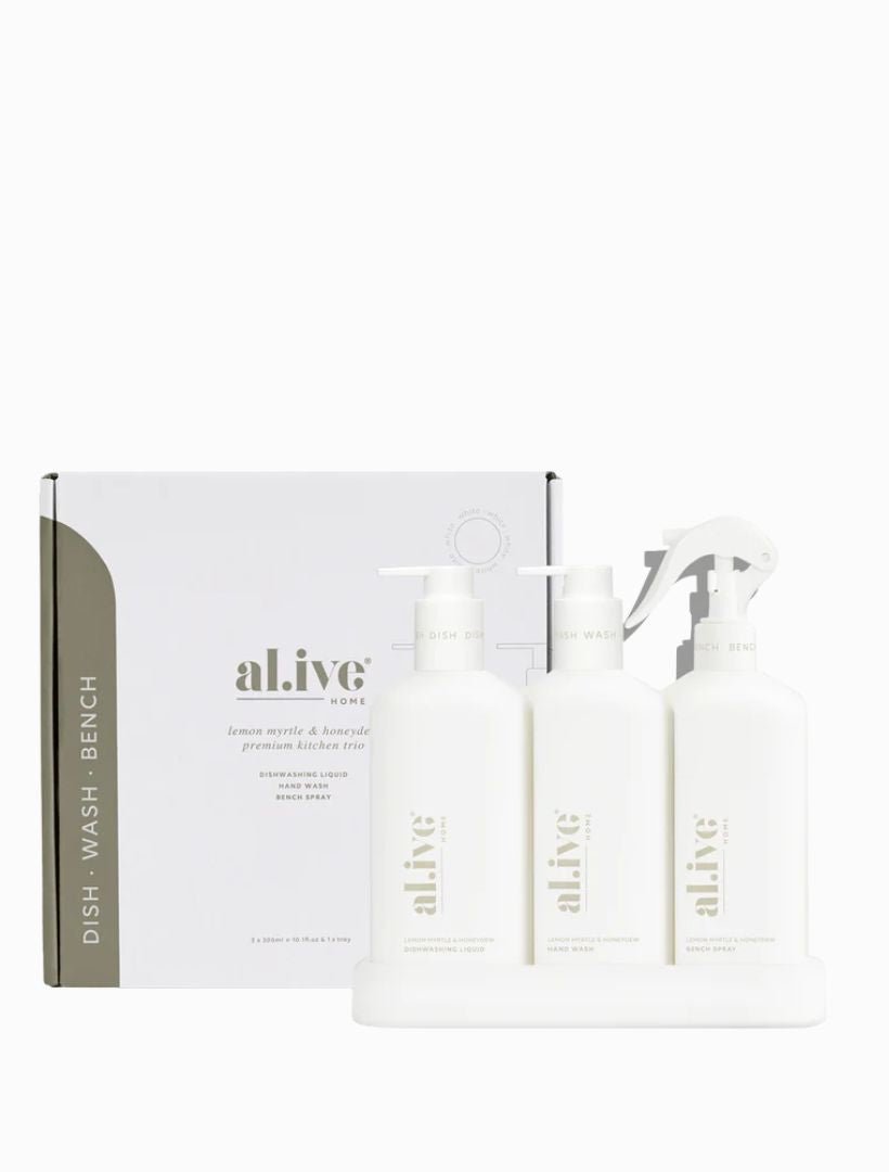 Transform your kitchen into a fresh, clean haven with the AL.IVE Lemon Myrtle & Honeydew Kitchen Trio. This beautifully designed set includes Dishwashing Liquid, Bench Spray, and Hand Wash, all elegantly presented in a custom tray that enhances your kitchen's style and organisation.
