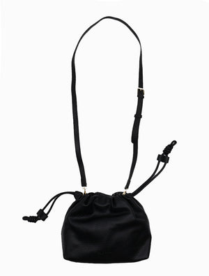Introducing the Ernie Crossbody Black! A versatile black drawstring pouch that offers a feminine touch while holding all your essentials. Change the shape instantly by pulling in the drawstrings to create a gathered, bucket style effect.