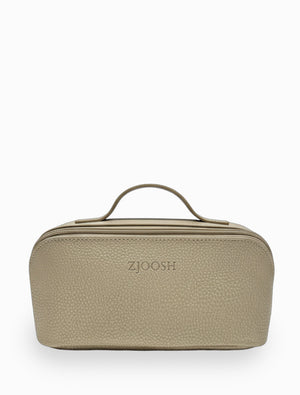 Organize your everyday essentials with a touch of elegance. This charming cosmetic bag, crafted from high-quality, textured vegan leather, brings a sophisticated yet relaxed feel to your daily routine. Available in a rich Pinot, a delicate Pink, and a radiant Gold, its distinctive design and unique diagonal zip closure, adorned with our signature charms, make it a stylish and practical accessory for any occasion.