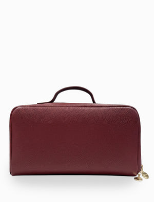 Elevate your organization with our spacious and stylish cosmetic bag. Crafted from high-quality, textured vegan leather, this larger-sized bag combines practical elegance with a relaxed aesthetic for your everyday needs. Available in a rich Pinot, a delicate Pink, and a radiant Gold, its distinctive design and secure zip closure, adorned with our signature charms, make it a sophisticated and functional accessory.