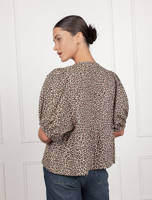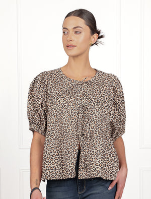 Introducing the Nadia Tie Front Top in Leopard, a chic and playful addition to your wardrobe, crafted from 100% breathable cotton. This stylish top features a captivating leopard print that adds a touch of fierce elegance to any outfit. Designed with a charming tie-front detail and delicate puff sleeves, the Nadia top offers a relaxed yet flattering silhouette, perfect for versatile styling.