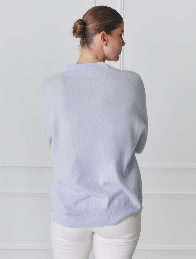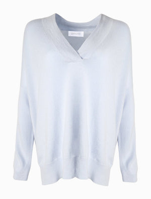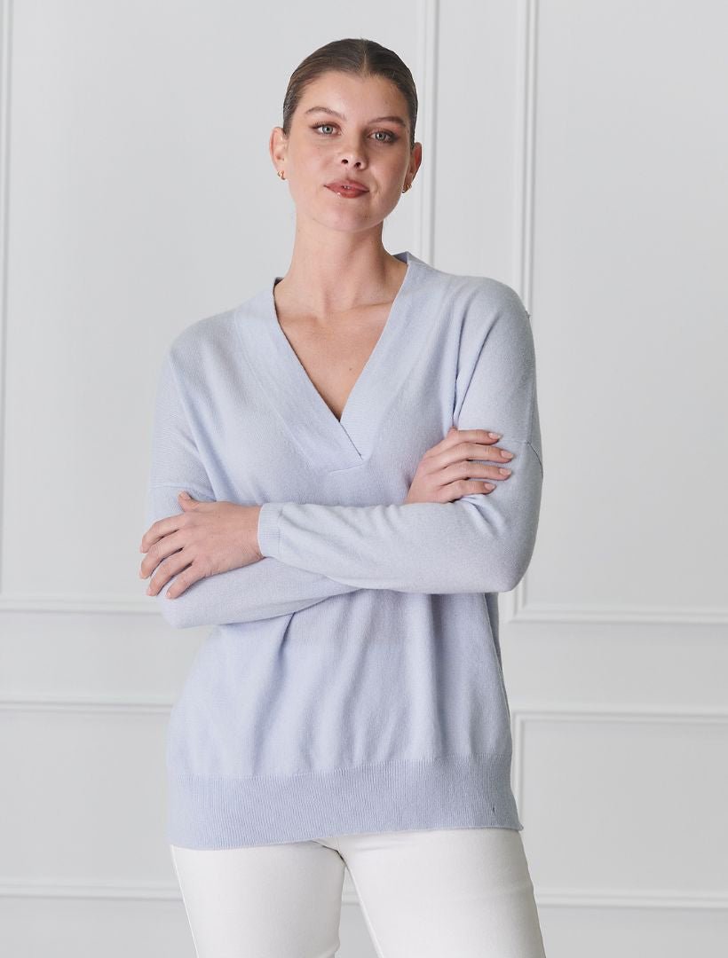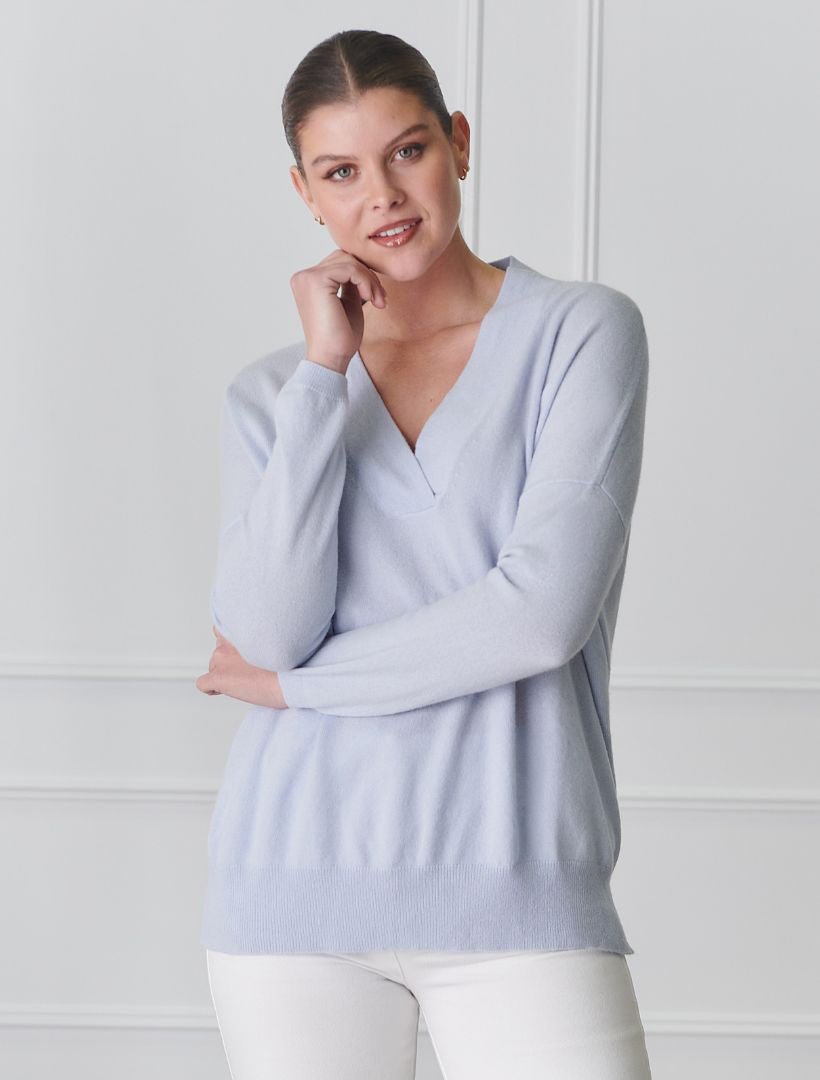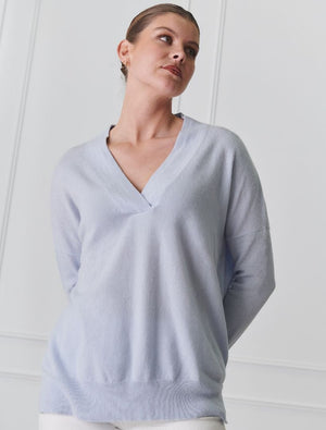 Crafted from pure Mongolian cashmere, the Boyfriend Cashmere Jumper Pale Blue is a beautiful winter knit that you will reach for time and time again. The slouchy style is the perfect knit to wear with classic denim or leather pants. So gorgeously soft and comfortable, the v-neck style is suitable for all body type.