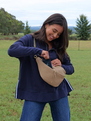 In true Zjoosh fashion, the cutest contrasting navy and white tape has been added on the side seams and cuff taking this casual sweatshirt to a sporty-luxe level!