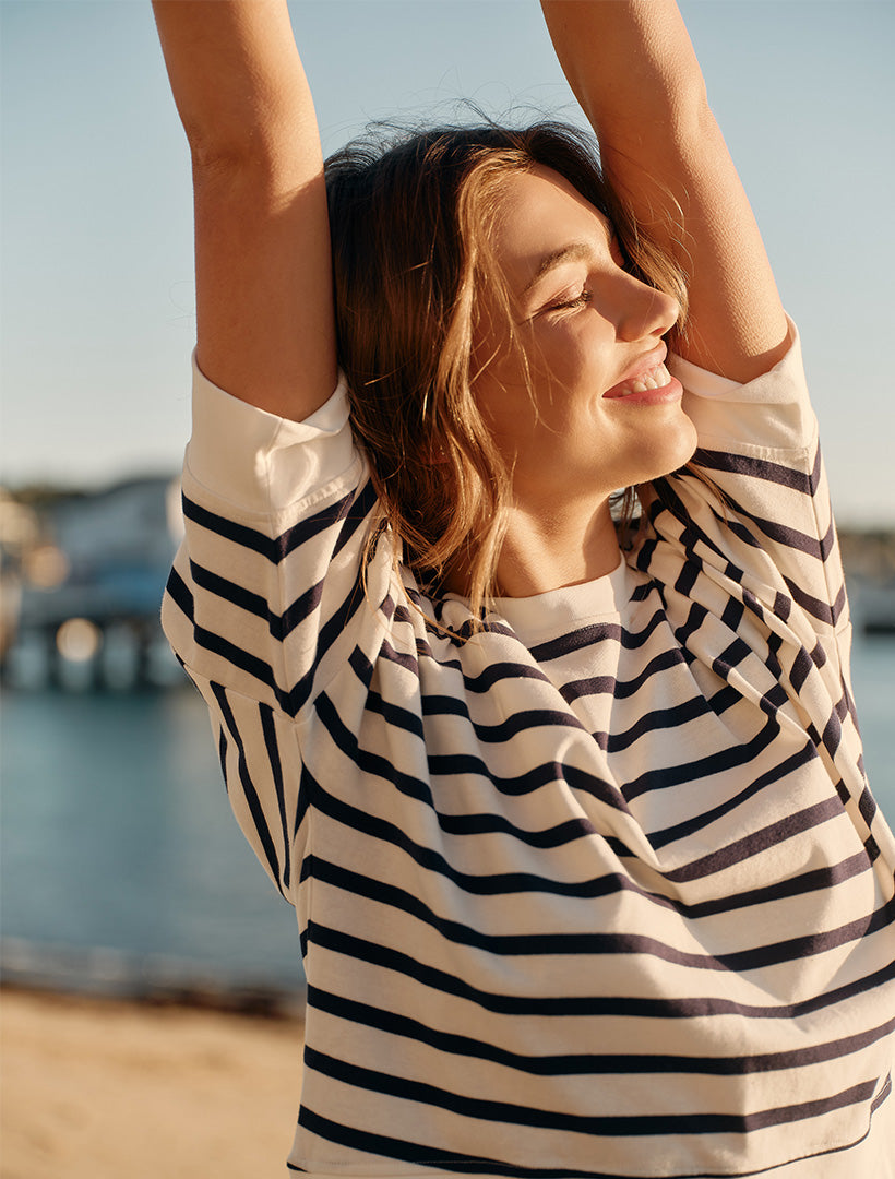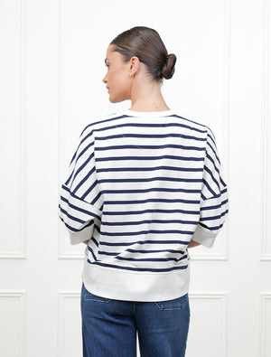 Our Anna Tee in Navy Stripe is a relaxed, sporty-luxe essential you’ll reach for again and again. Made from beautifully soft cotton in a yarn-dyed terry finish, it feels effortlessly comfortable against the skin, perfect for lounging at home or adding a laid-back touch to your everyday style.