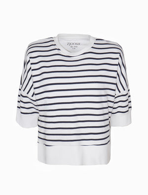With its classic navy and white stripes, dropped shoulders, and slightly oversized silhouette, the Anna Tee brings casual chic to any outfit. The contrasting hem and sleeve cuffs add a subtle Zjoosh twist, giving this wardrobe staple that elevated, sporty-luxe edge. Wear it with your favourite lounge pants or pair it with denim for an easy, polished look.
