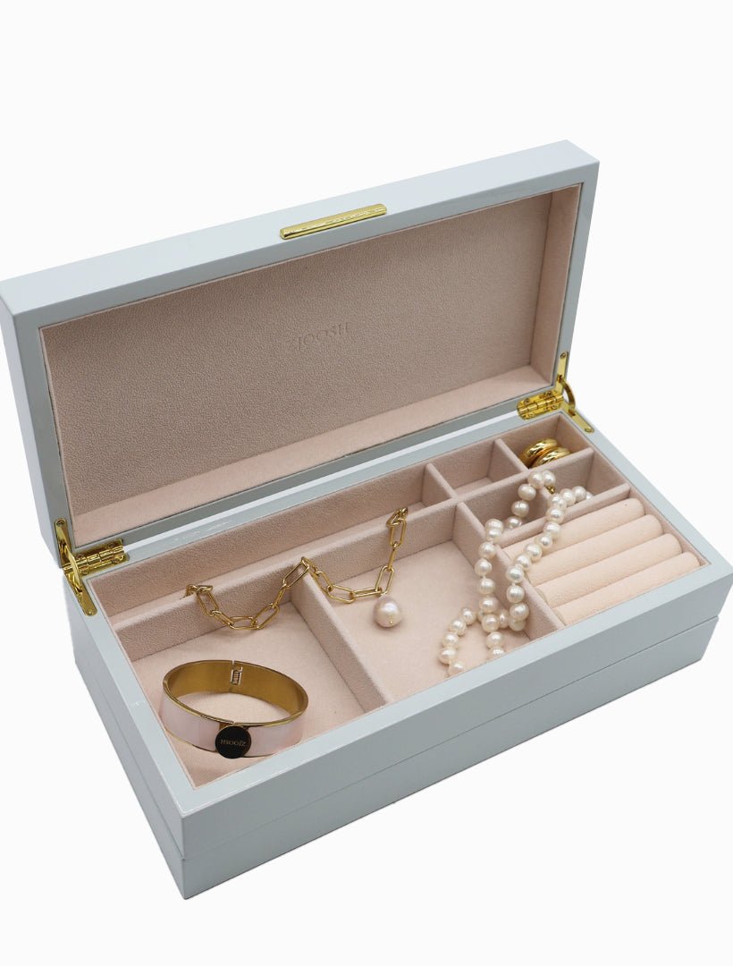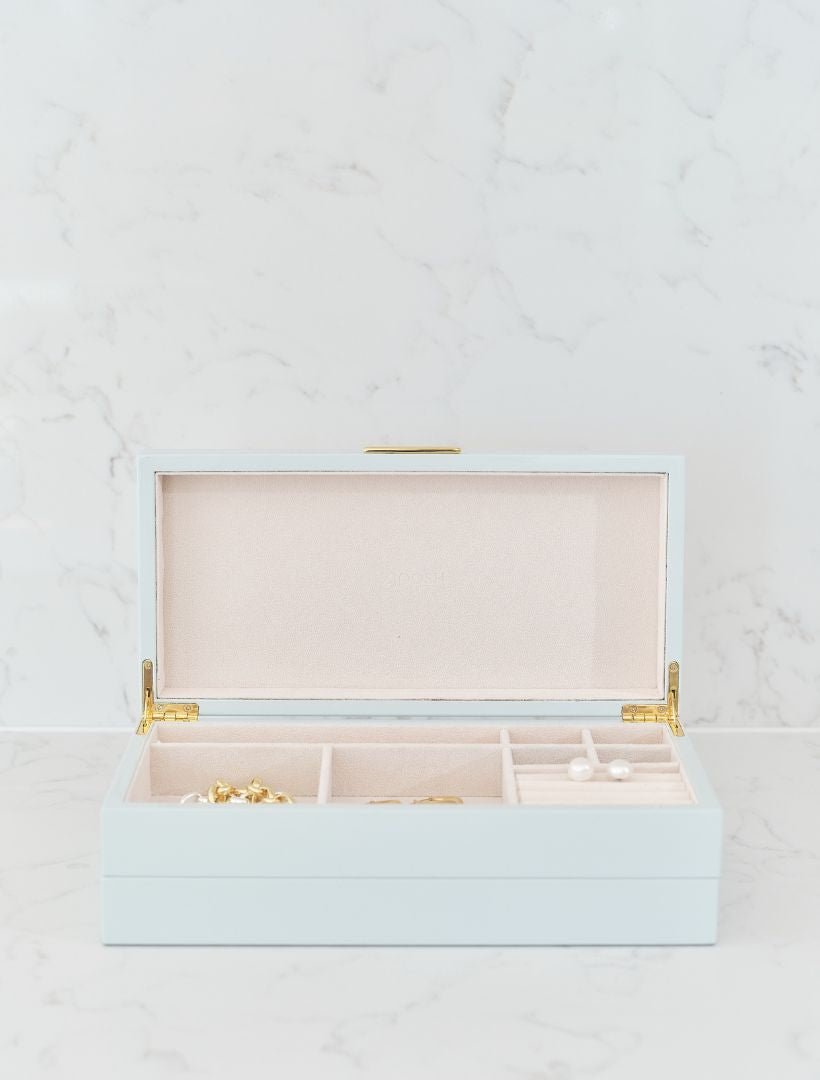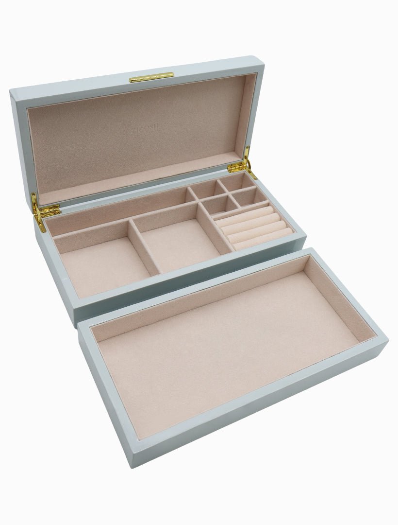 The Stacking Lacquered Jewellery Box Blue is practicality at its finest. With its high-gloss lacquered finish and soft blue colour, this luxury stacking jewellery box will keep your gems safe.