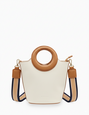 A modern take on classic styling, the Charlie Bag Tan White is your perfect everyday companion. Featuring a striking circular handle in contrast tan and white tones, this versatile piece can be carried by hand for a chic statement look or worn crossbody with the detachable webbing strap for hands-free ease.
