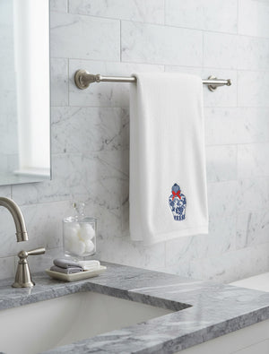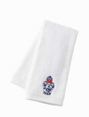 The embroidered blue urn with a bright red bow adds a classic holiday moment without overwhelming your décor, making it an easy styling win for guest bathrooms, powder rooms or gift hampers.