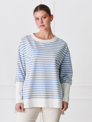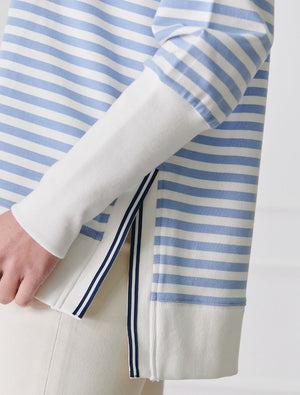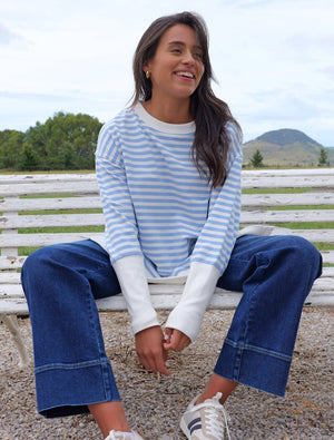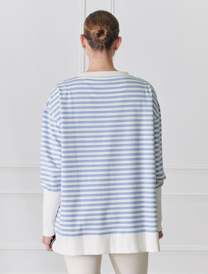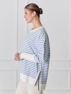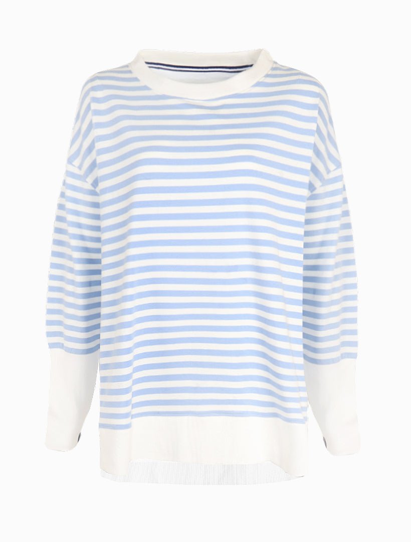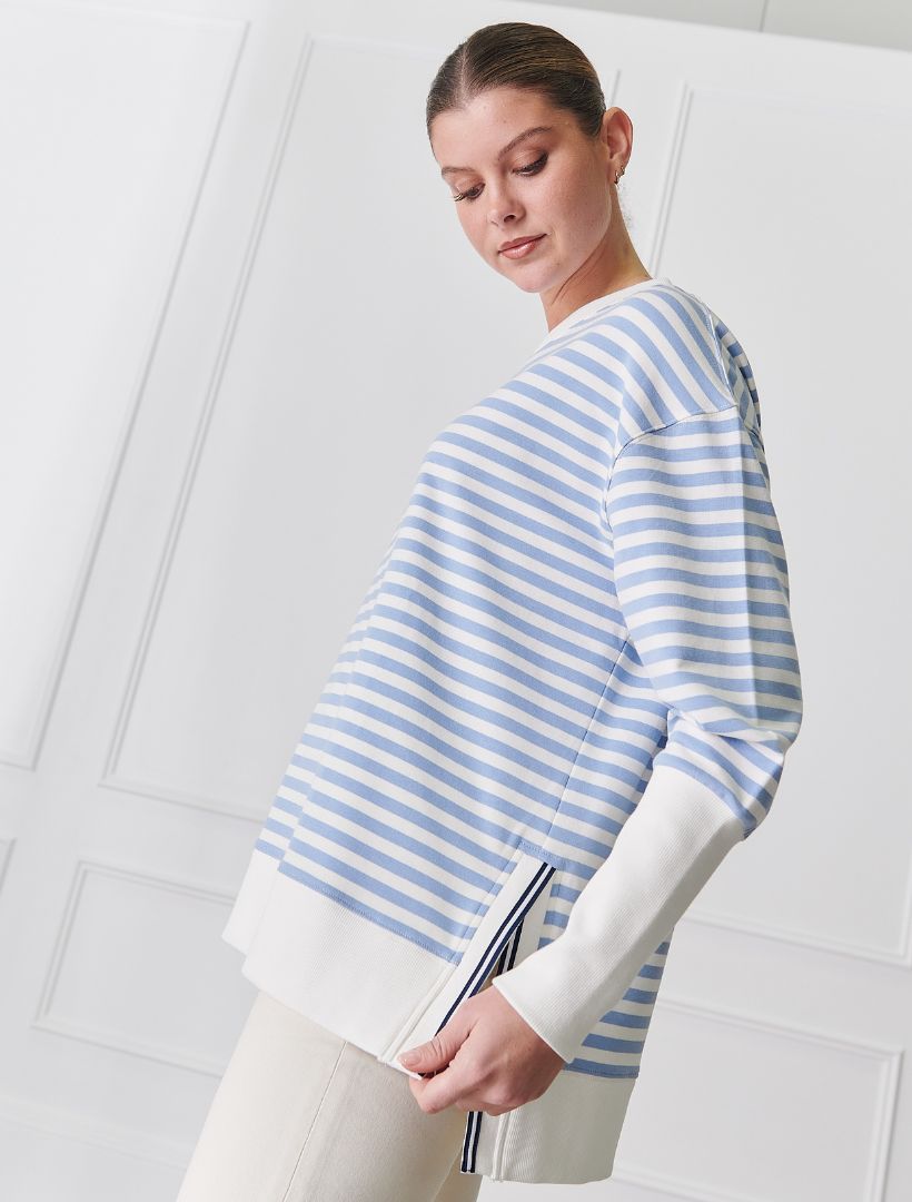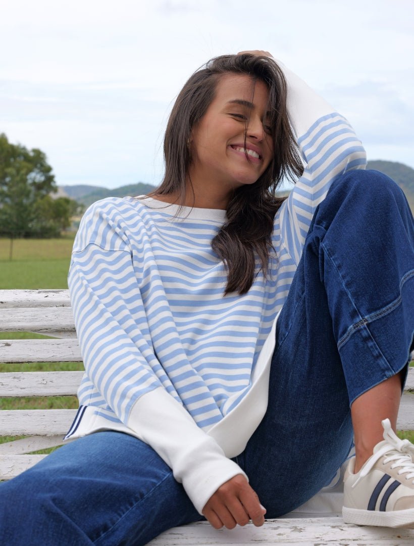 Our Claudia Striped Sweatshirt Blue is crafted from a beautiful washed cotton, with a super soft feel. After selling out time and time again - this signature oversized jumper has made a return in a light blue shade! The Claudia is a blue and white stripped jumper featuring relaxed drop shoulders and fitted sleeves.