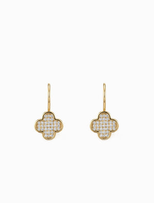 These enchanting gold earrings feature a charming clover design, sparkling with delicate crystals. Hanging gracefully from elegant French hooks, they offer beautiful movement and a captivating shimmer with every turn.