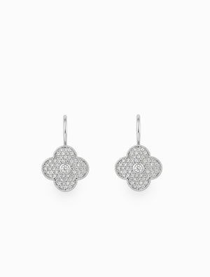 These luxurious silver French hook earrings feature a stunning clover design, completely paved with sparkling crystals. A single, larger crystal sits at the center of each clover, adding an extra touch of brilliant shine.