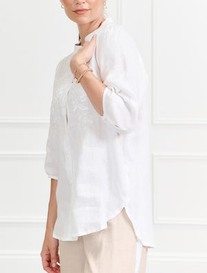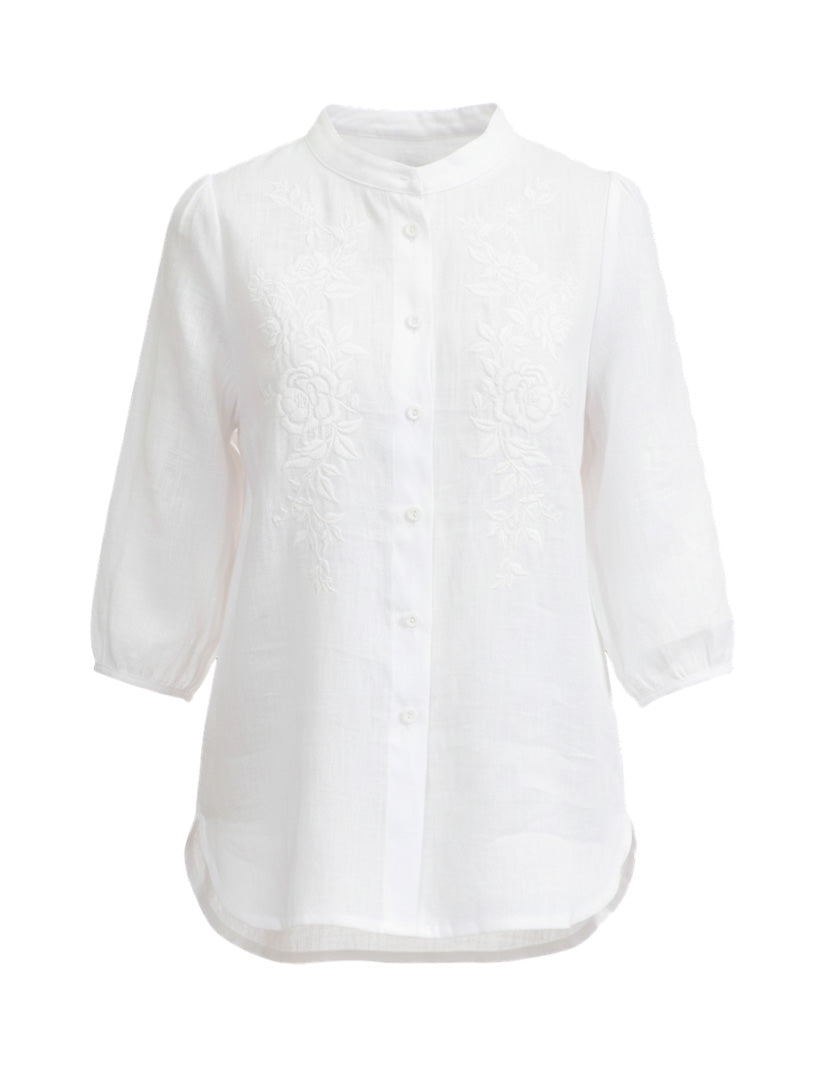 Meet the Evie Linen Shirt – your new wardrobe favourite! Made from 100% beautiful linen, this crisp white shirt is all about comfy elegance. The delicate embroidery adds a special touch, making it stand out from your everyday tops.