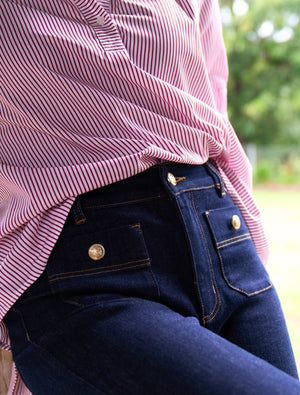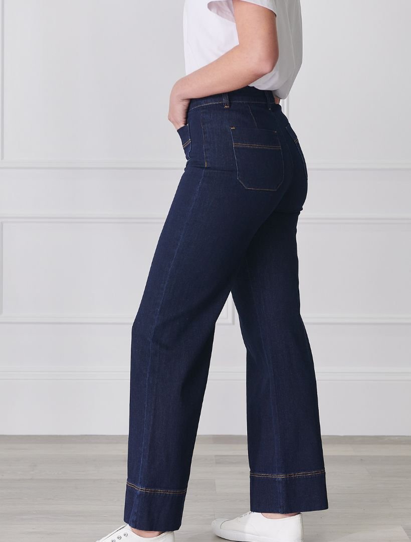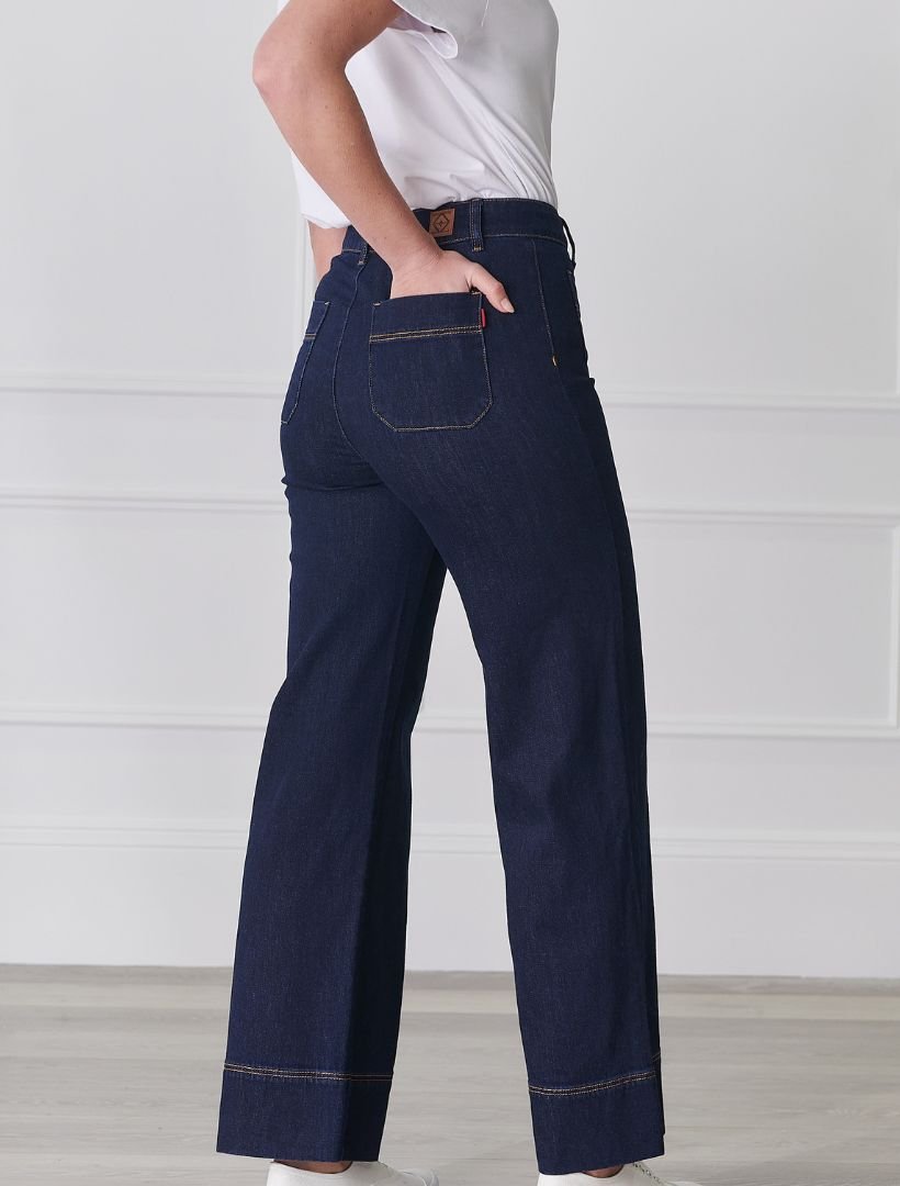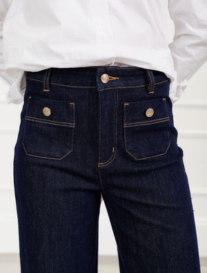 The Farrah Pocket Jean Ink are a striking addition to any wardrobe and perfect for any lover of riffs on classic styles. Crafted from a gorgeous thick stretch denim with high elastane content, these wide leg dark jeans feature eye catching gold button detailing on the front pockets and zipper closure.