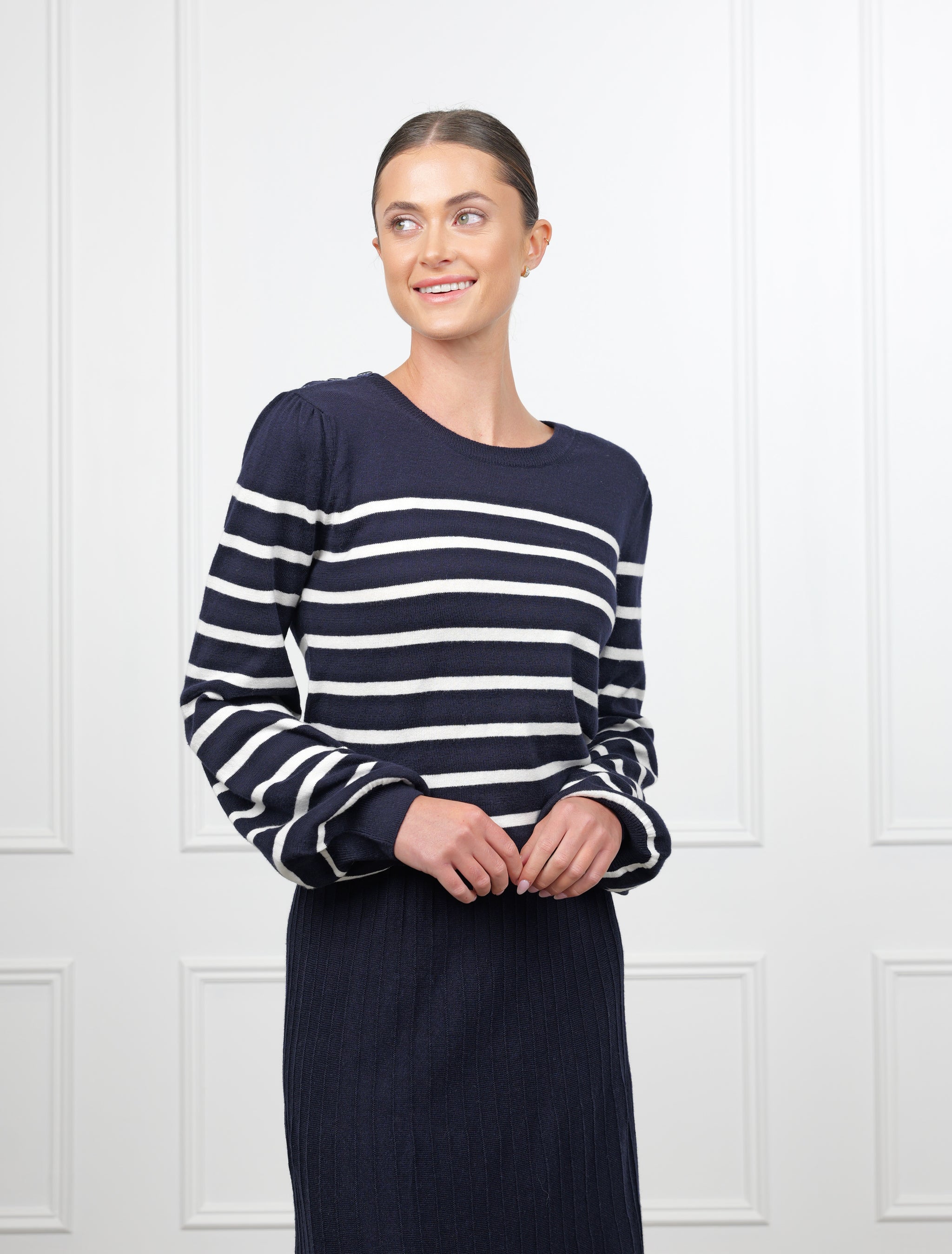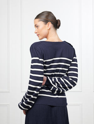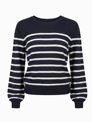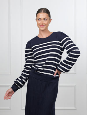 The Gwynie Knit is a wardrobe essential crafted from a premium blend of 90% cotton and 10% cashmere. This combination provides the breathable comfort of cotton with a touch of luxury and warmth from the cashmere. Featuring a classic striped pattern, this jumper offers a clean and timeless look that works perfectly for any season.
