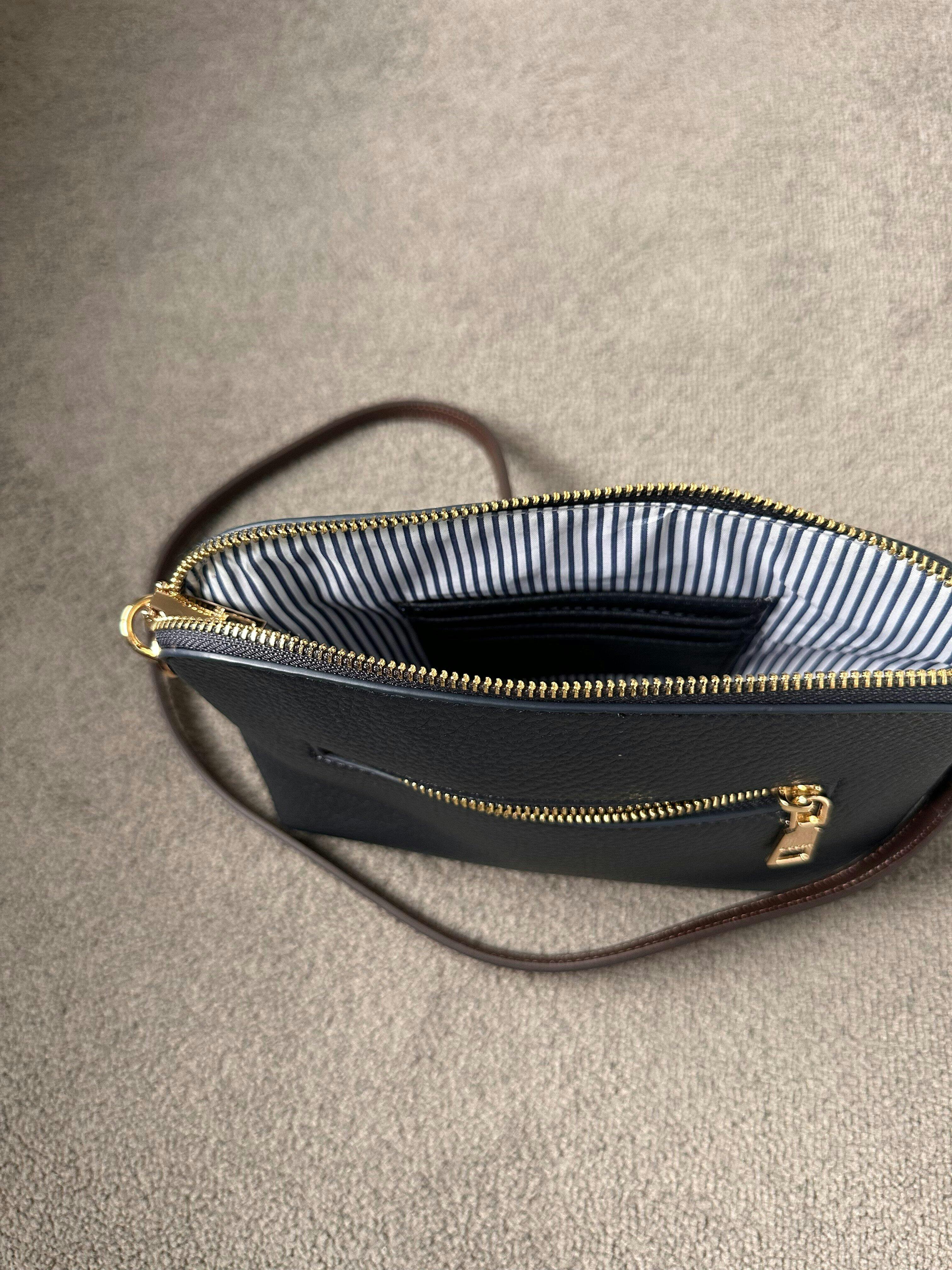 Our latest Hudson Cross Body Bag Navy combines style and function with two removable straps: a classic PU strap with gold chain and a playful webbing strap. A versatile bag perfect for when you need to carry a little bit more than your everyday essentials. Do it with style in this navy cross body bag.