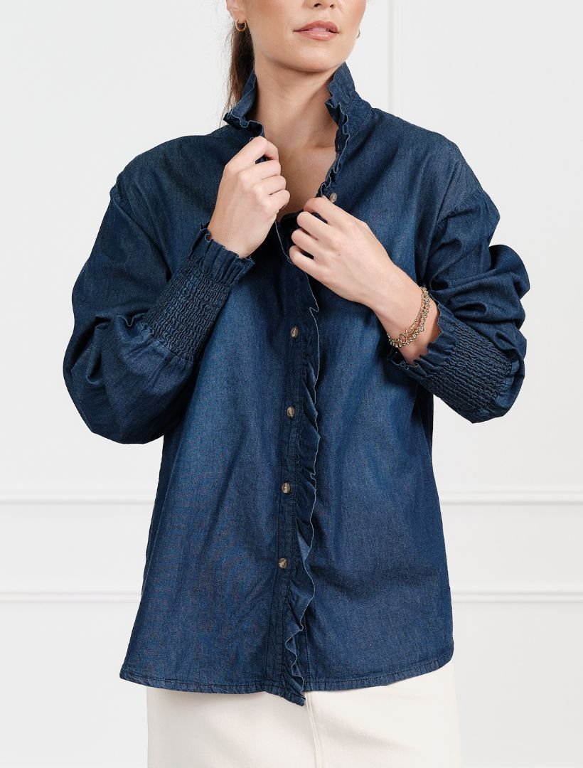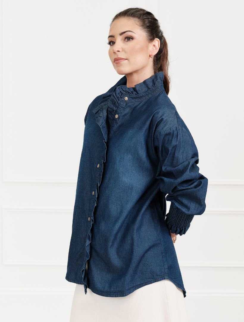 The Jessica Denim Shirt Indigo is a stylish twist on the classic denim shirt, featuring frilled detailing down the front placket and collar for a feminine touch. Crafted from premium denim, this frilled shirt is easy to style and pairs perfectly with your existing wardrobe staples. The delicate frills enhance its design, making it ideal for casual and dressed-up occasions.