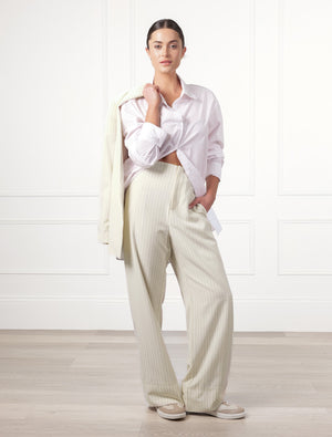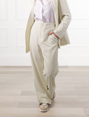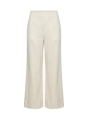 This cream pant is both stylish and comfortable, with a wide-leg design that looks great on everyone. It features a subtle striped pattern, making it perfect for dressing up or down.