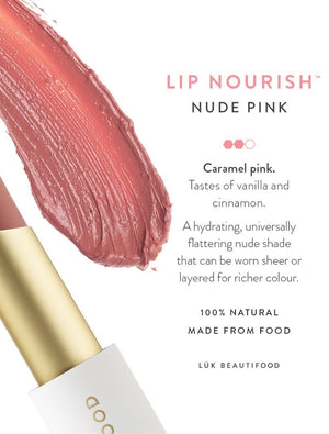 The Lip Nourish Lipstick Nude Pink is a nourishing stick for 24/7 moisture, day and night. A caramel pink colour that tastes of vanilla & cinnamon. A conditioning colour to hydrate and feed lips for an effortless healthy glow