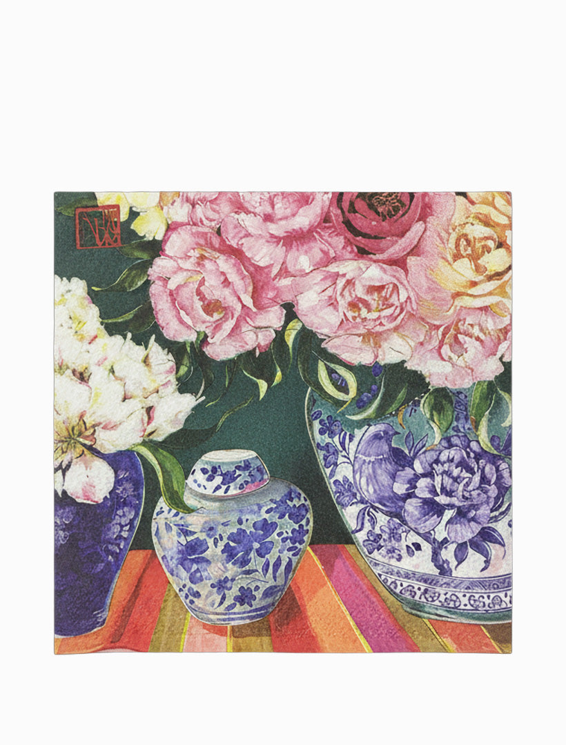 Featuring a vibrant still life of lush pink and cream blooms nestled in beautifully patterned blue and white chinoiserie vases and a ginger jar, these napkins are bursting with color and sophisticated artistry. Crafted from luxurious triple-ply paper, they're not just gorgeous – they're super absorbent and durable, making cleanup a breeze. Plus, they're FSC certified, so you can feel good about your eco-chic choice. Printed in Germany with non-toxic, water-based, and food-safe inks, these napkins are perfect for adding a pop of painterly elegance to your next soirée, afternoon tea, or simply making your everyday feel a little more special!