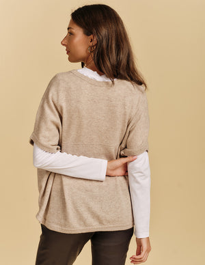 Designed as a versatile layering piece, this top works well over long-sleeve shirts or on its own. The wide, short sleeves and loose shape create a modern look that is easy to style. It is a practical and cozy staple that pairs perfectly with jeans or trousers.