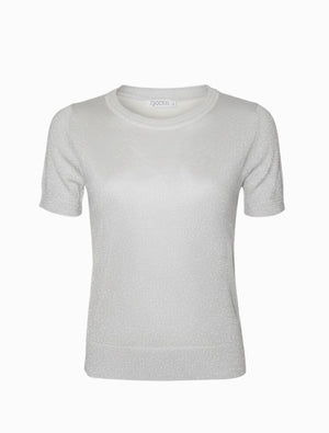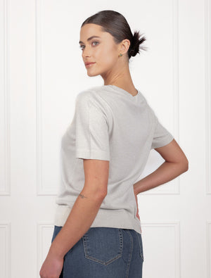 The Melanie Short Sleeve Sparkle Knit Silver combines the luxurious feel of bamboo and lurex, bringing a subtle touch of golden shimmer. This beautifully designed piece is fitted and true to size, offering a flattering shape that’s perfect for both day and evening wear.