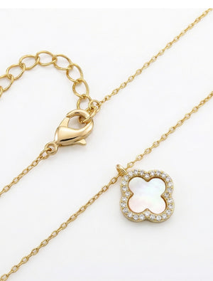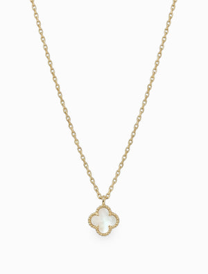 This delicate gold necklace features a charming clover pendant, exquisitely inlaid with luminous mother of pearl. The natural shimmer of the mother of pearl adds a soft, iridescent glow, beautifully framed by intricate gold detailing.