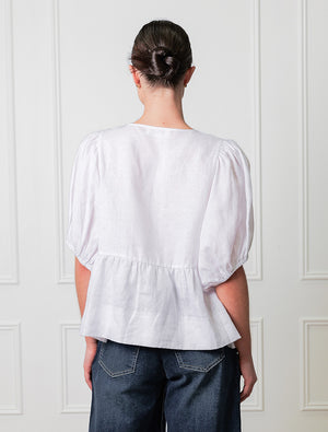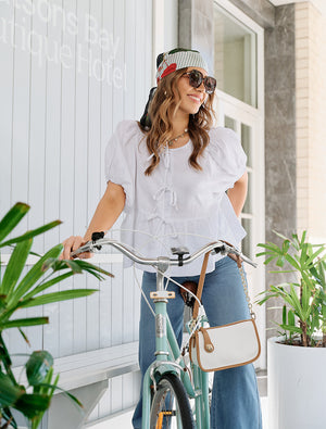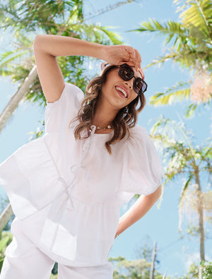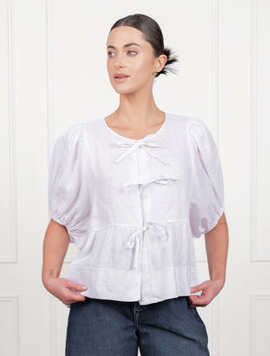 Featuring a soft round neckline and three delicate front ties, the design offers a romantic yet relaxed silhouette. The puff sleeves and slightly flared hem add shape and ease, while the tie detail creates subtle definition through the waist. Pair it with denim or tailored linen shorts for a polished off-duty look.