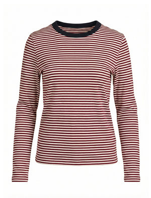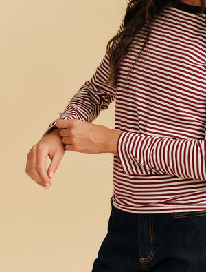 Paris striped Long Sleeve Tee is a soft, long-sleeved shirt with thin, horizontal stripes in white and a deep reddish-purple color. The fabric is a smooth cotton blend that feels stretchy and thick, fitting comfortably against the skin while moving with you easily.