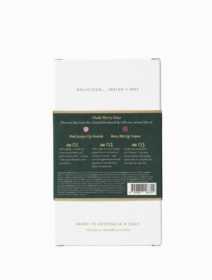 The Lip Nourish Lipstick Nude Berry Duo is a nourishing pair designed to hydrate, define and enhance lips with effortless natural colour. Includes a Pink Juniper Lip Nourish and a Berry Bite Lip Crayon, for a soft, flattering look that works for every skin tone.