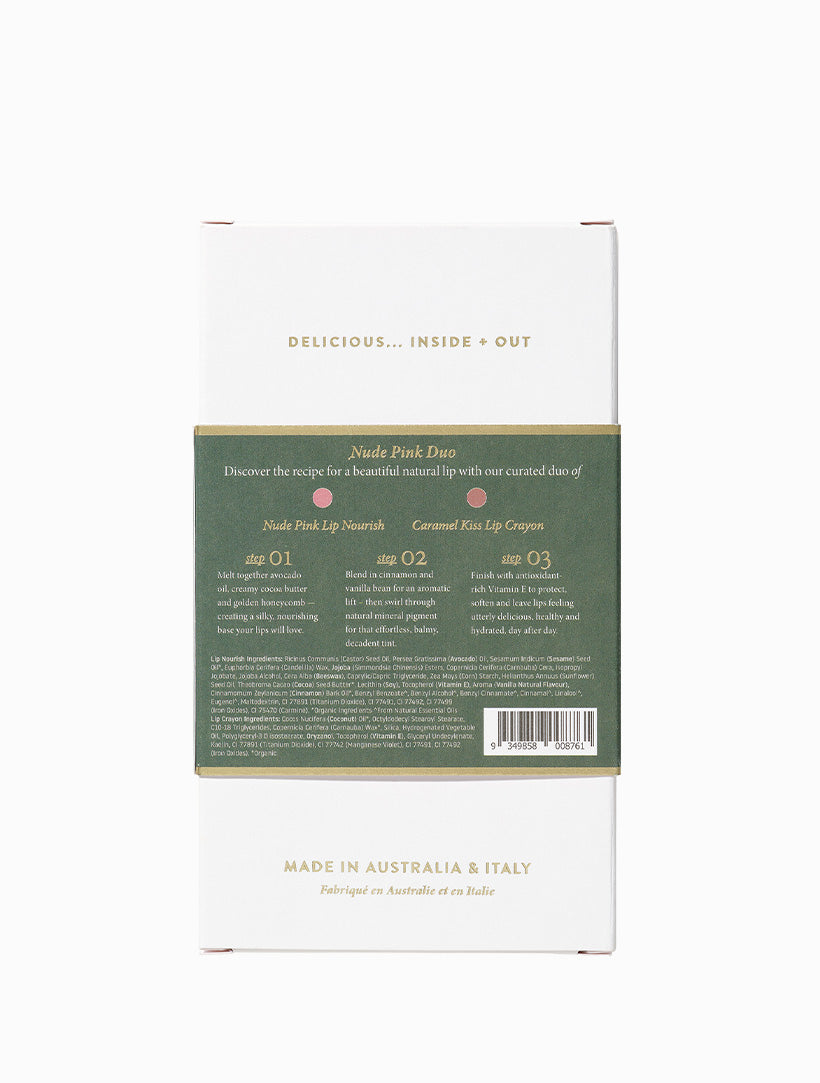 The Recipe of a Lipstick Nude Pink is a nourishing pair designed to hydrate, define and enhance lips with effortless natural colour. Includes a Nude Pink Lip Nourish and a Caramel Kiss Lip Crayon, for a soft, flattering look that works for every skin tone.