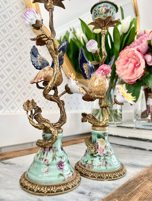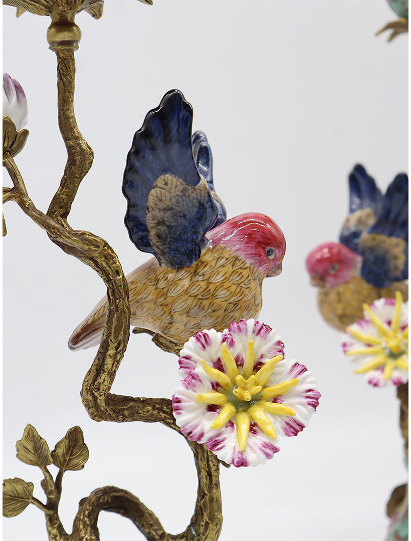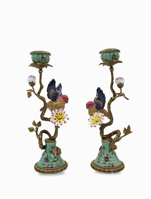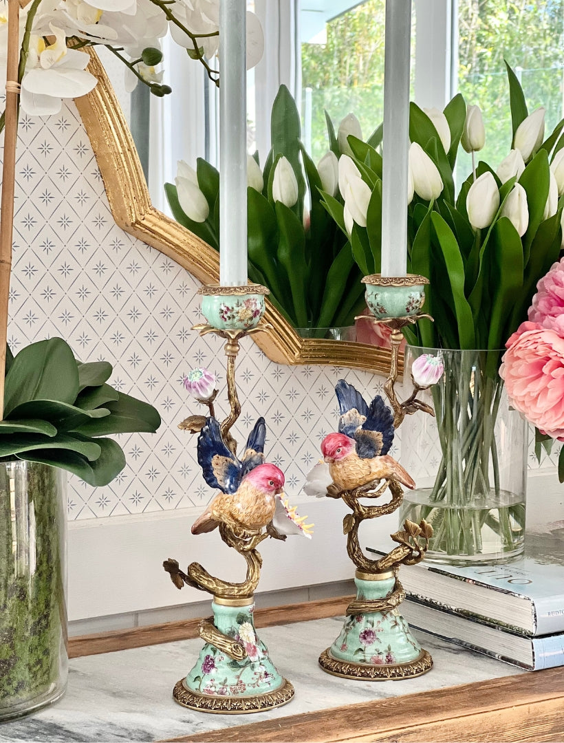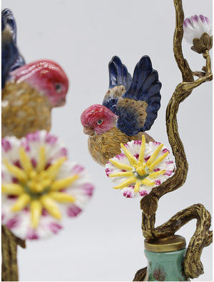 The Robin Candelabra Set of 2 White adds elegant charm and warmth to any room. Bring a sense of timeless elegance to your décor with this exquisite pair of candle holders. Crafted with meticulous detail, they blend hand-painted porcelain and richly gilded bronze in a harmonious, Art Nouveau–inspired design.