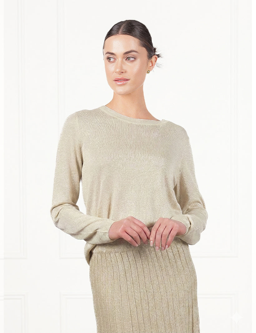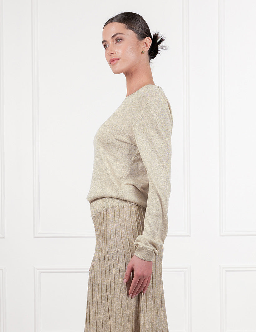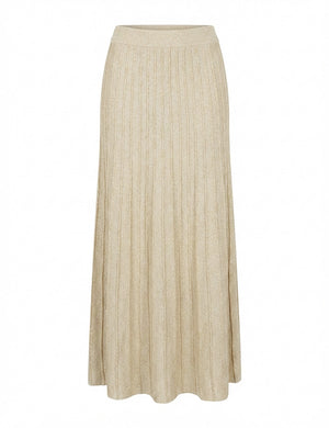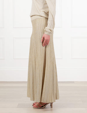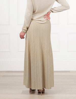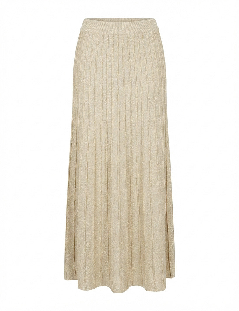 The Sunray Sparkle Knit Skirt in Gold features a fitted waist and elegant "sunray" pleats that create a long, flattering line. The metallic gold yarn is knitted directly into the fabric, providing a rich shimmer and graceful movement as you walk.