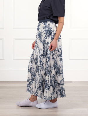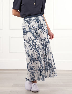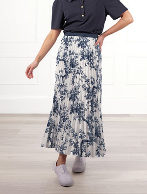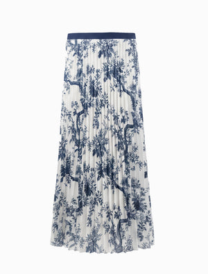 This lovely navy and white skirt is made from a soft, flowing material that feels great. It has a classic blue and white design with pretty trees and scenes, making it a stylish piece for your closet.